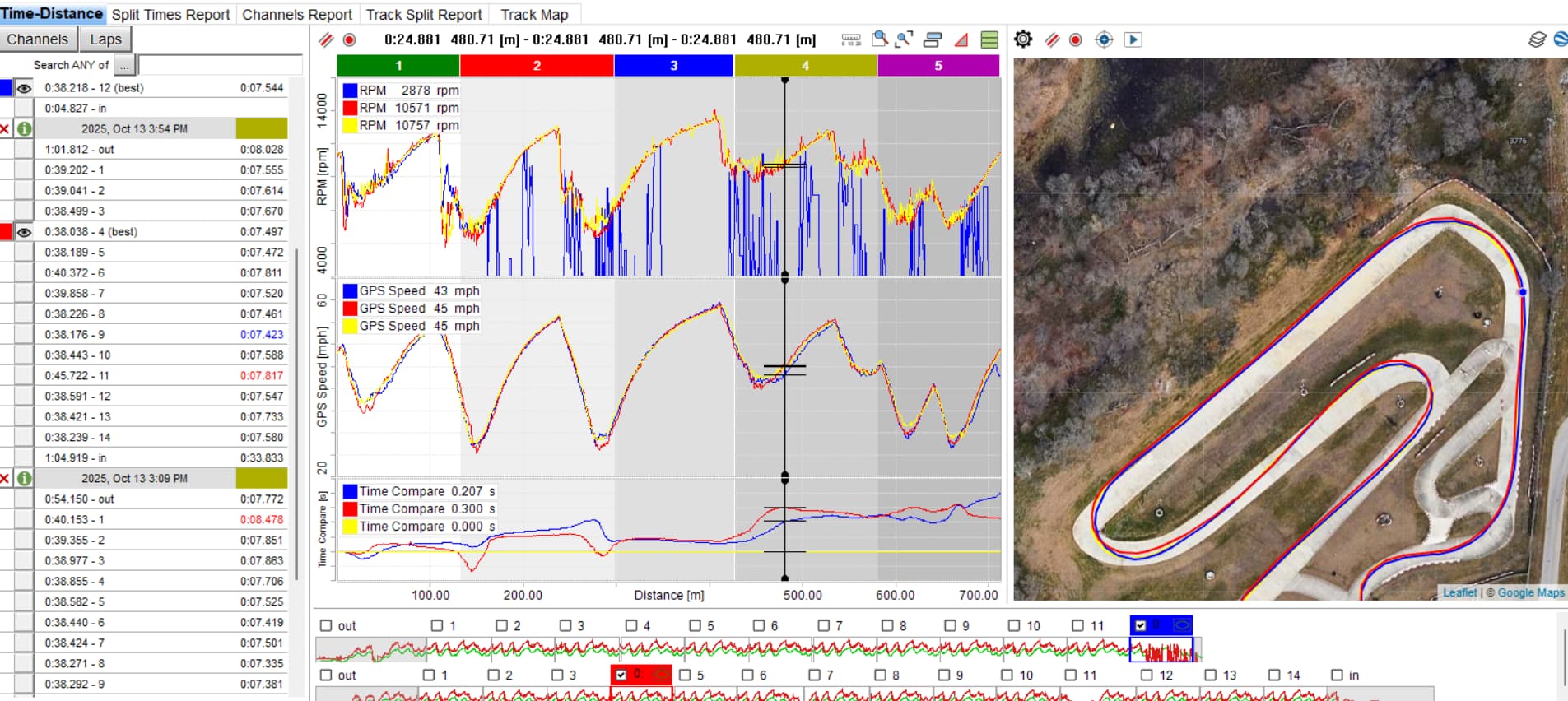 Data analysis: Yellow is a 37.8 on used Levantos, Red is a 38.0 on used Evinco Blues, Blue is a 38.2 on new Evinco Blues, and I don’t have data from Tommy’s reference lap but he was doing mid 37s that day. Red and blue laps lost time coming out of the slow turn 2 and lost even more time through the fastest corner on the track, which is a very bumpy right-hand uphill sweeper that we call Helter Skelter (turn 4, 0:26 in the video). I couldn’t find a good track map online, so I made one. I really need to get data from Tommy. Sorry I don’t have good data to compare mine to: