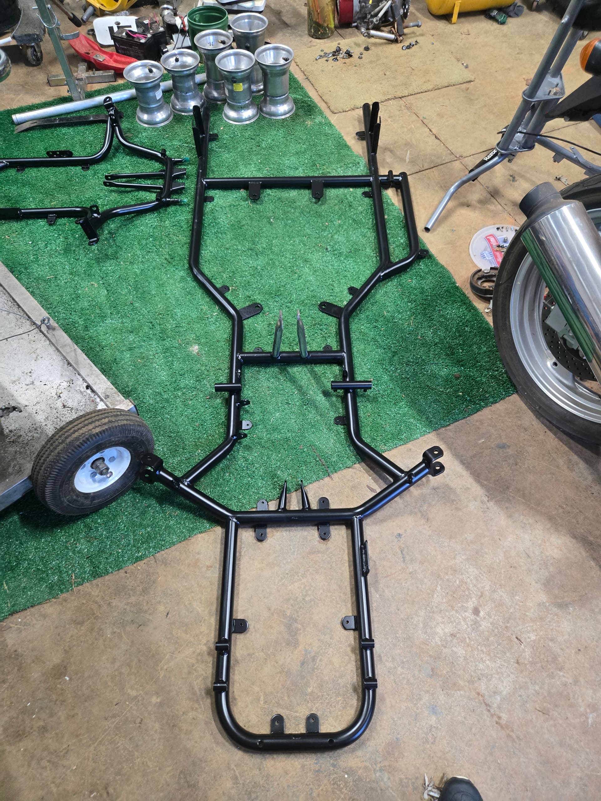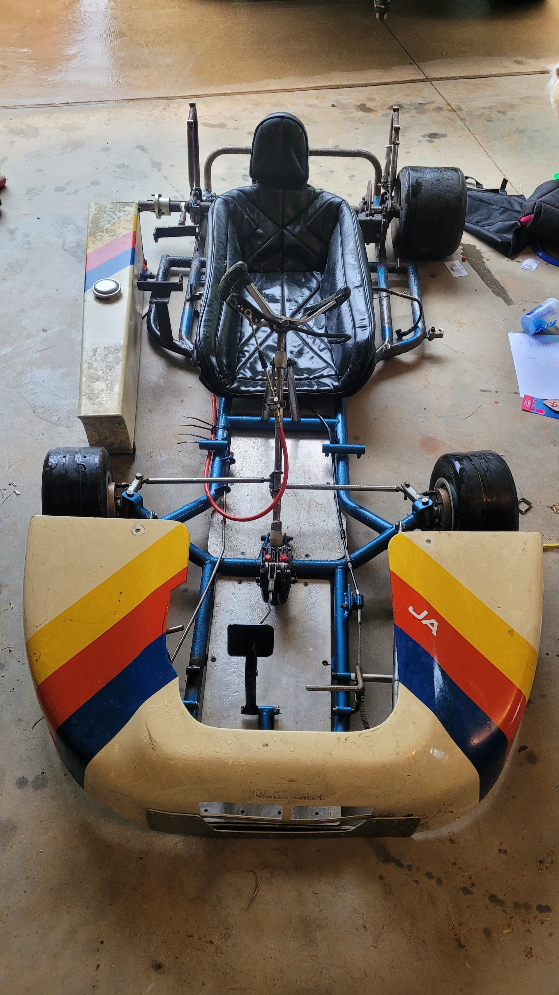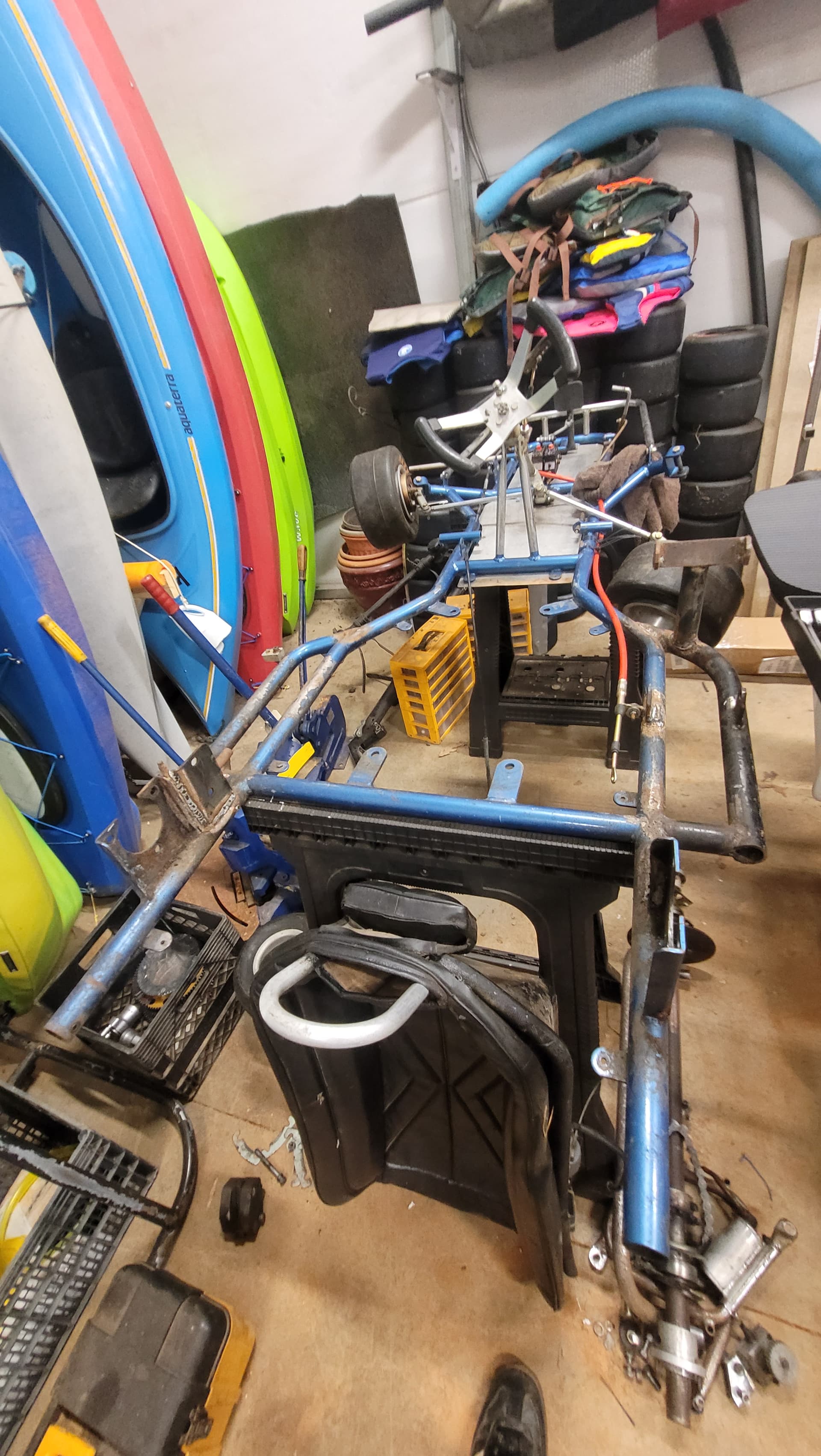 This isn’t my only kart project… I’ve found a couple of cheap oval karts locally, so I acquired them, and I have a vintage Margay that was local also. So, I was able to find a sandblaster to strip them all, and a local powdercoater is doing 3 frames for me for $100/ea. A steal! Big thanks to SFD Industries, more famous for their drift trikes!! I got time to grind and sand, so here she is now: (VIDEO) https://www.facebook.com/share/v/1KRqDXdSTX/