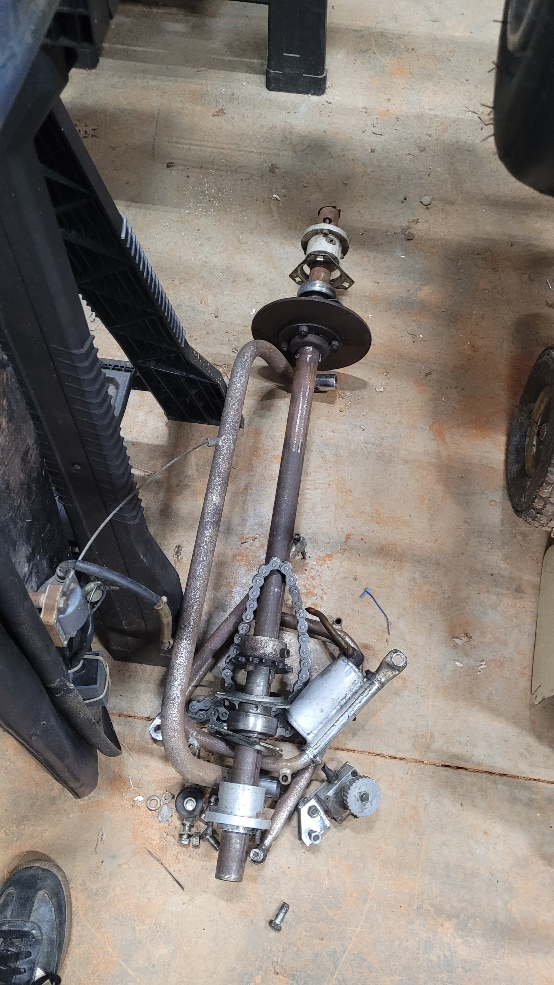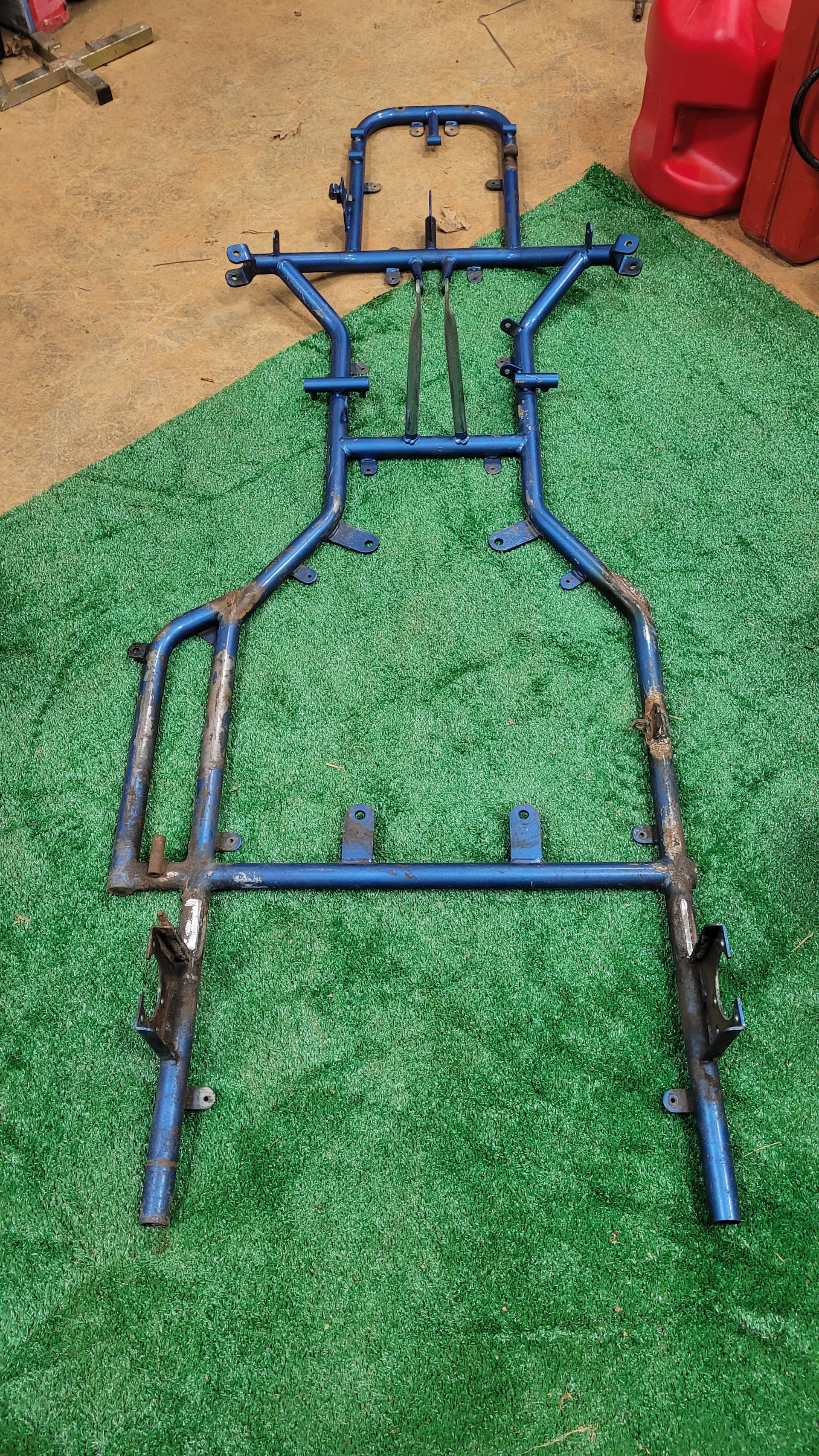 I get the thing home, and proceed to break it down and remove the kludgy weld-ons the PO had tried. Apparently he was going to mount the motor on the other side and created another motor rail of water pipe and some various other bits and farkles… I’ll give him credit, he was a good welder…but tubing selection and such all wrong, and bodgered up the original frame to an extent.